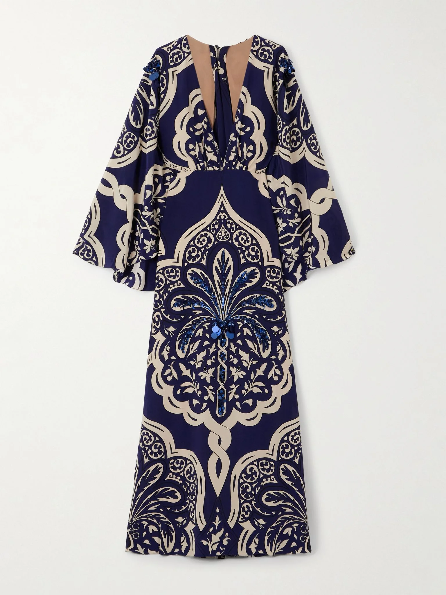 Johanna Ortiz's maxi dress is printed with a pretty damask-inspired motif made even more striking by the sequins and beads. It's made from silk-crepe and has a plunging neckline and cape-effect sleeves. Elevate yours with flat sandals and gold jewelry on vacation. Size & Fit - Fits true to size, however those who are between sizes should take the smaller size - Designed for a slightly loose fit with oversized sleeves - Lightweight, non-stretchy fabric - Model is 180cm/ 5'11" and is wearing a US 4 Model measurements: - Bust: 85cm/ 33.5" - Waist: 62cm/ 24.5" - Hip: 88cm/ 34.5" Details & Care - Navy, ecru and black silk-crepe - Button-fastening keyhole and concealed zip at back - 100% silk - Dry clean