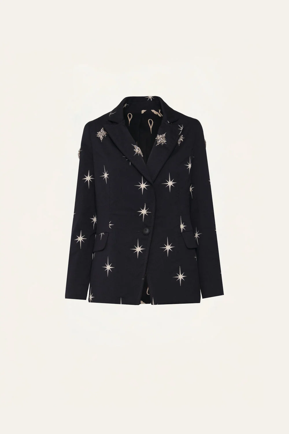 A tailored blazer cut in embroidered cotton jacquard adorned with delicate star motifs. Its boxy fit and structured shoulders lend a refined, modern edge. Pair it with the matching dress for a coordinated look or style it over neutral separates for a polished finish. Size and Fit: Boxy fit. True to size. Please refer to our size chart for detailed guidance. Product Details: Closure: Front Buttons Composition: 72% Cotton, 24% Polyamide, 4% Elastane Fabrication: Cotton Jacquard Color: Black/Ecru Made in Colombia