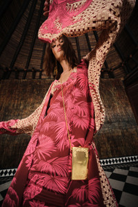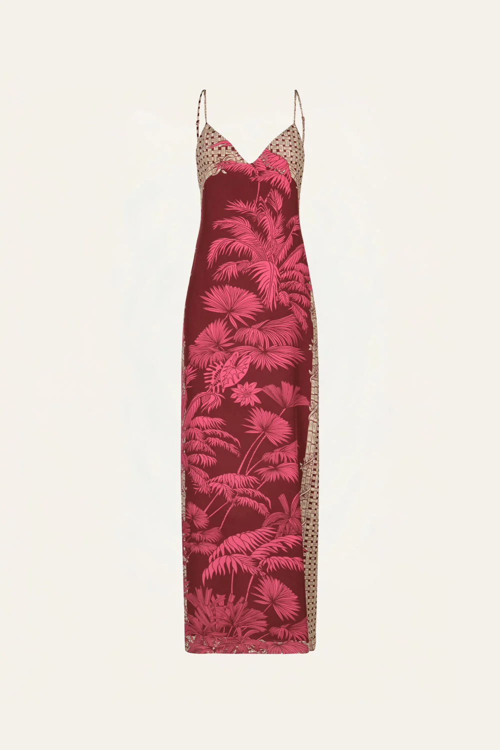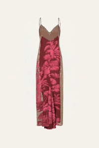 A flowing silk maxi dress featuring slender straps and a soft, fluid drape. Designed with delicate print placement, it can be paired with the matching kimono for a coordinated look or worn on its own for an effortless statement. Size and Fit: Runs small based on customer feedback; consider sizing up for the best fit. Maxi length. Please refer to our size chart for detailed guidance. Product Details: Closure: Back Zipper Composition: 100% Silk Fabrication: Washed Cdc Color: Ecru/Pink Made in Colombia Dimensions: Length 44.09''