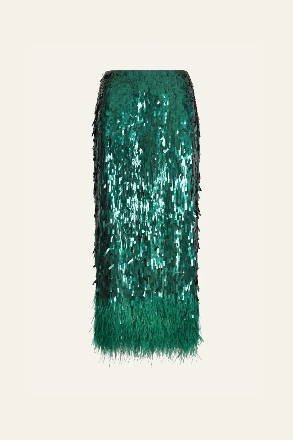 Feathered sequins add a touch of allure, making it an ideal choice for special occasions. The back zipper closure allows for easy wearing and removal. Product Details: Composition: Polyester 40%, Polyvinylchloride 40%, Feather Trim 20% Fabrication: Sequins Color: Forest Green Made in India