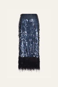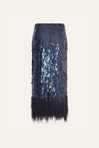 Feathered sequins add a touch of allure, making it an ideal choice for special occasions. The back zipper closure allows for easy wearing and removal. Product Details: Composition: Polyester 40%, Polyvinylchloride 40%, Feather Trim 20% Fabrication: Sequins Color: Midnight Blue Made in India