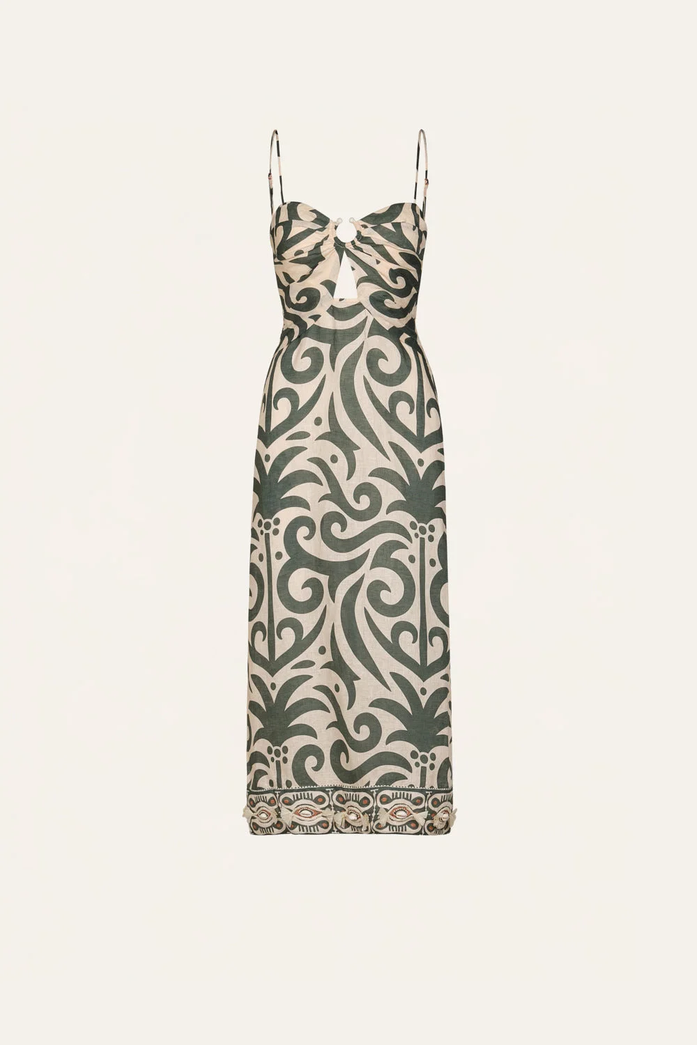 A midi-length linen dress designed for warm-weather soirees. Featuring slender straps, a ring detail at the bust, and subtle cutouts, it’s finished with intricate embroidery along the hem. The silhouette blends ease with sophistication, making it a standout for day-to-night dressing. Size and Fit: True to size. Please refer to our size chart for detailed guidance. Product Details: Closure: Slip On Composition: 100% Linen Fabrication: Light Linen Color: Ecru/Green Made in Colombia Dimensions: Length 36.22''