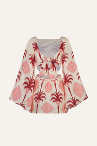 A lightweight linen mini dress featuring a bold ecru, paprika, and light pink print. Designed with a square halter neckline, wide sleeves, and subtle waist cutouts for an effortlessly feminine silhouette. Size and Fit: - True to size. - Please refer to our size chart for detailed guidance. Product Details: Closure: Tie At Back Composition: 100% Linen Fabrication: Light Linen Color: Ecru/Paprika/Light Pink Made in Colombia Dimensions: Length 15.4''