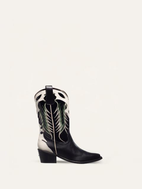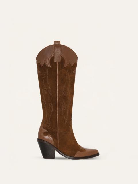 Knee-high boots crafted in soft suede and calf leather, finished with a 5cm heel. Western-inspired appliques accent the heel, toe, and collar, bringing a cowgirl twist to this sleek, city-ready silhouette. Product Details: Closure: Slide On Composition: Outer Shell: 70% Bovine Leather, 30% Suede Leather, Lining And Insole: 100% Chamois Leather, Sole: Croupon - Heel: Wood Fabrication: Leather Boot Color: Iconic Black Made in Colombia Dimensions: Height: 20.47'', Heel Height: 3.15''