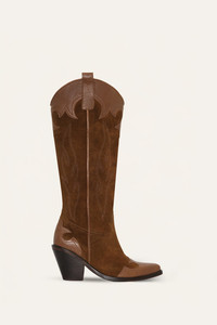 Knee-high boots crafted in soft suede and calf leather, finished with a 5cm heel. Western-inspired appliques accent the heel, toe, and collar, bringing a cowgirl twist to this sleek, city-ready silhouette. Product Details: Closure: Slide On Composition: Outer Shell: 70% Bovine Leather, 30% Suede Leather, Lining And Insole: 100% Chamois Leather, Sole: Croupon - Heel: Wood Fabrication: Leather Boot Color: Camel Made in Colombia Dimensions: Height: 20.47'', Heel Height: 3.15''