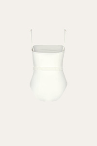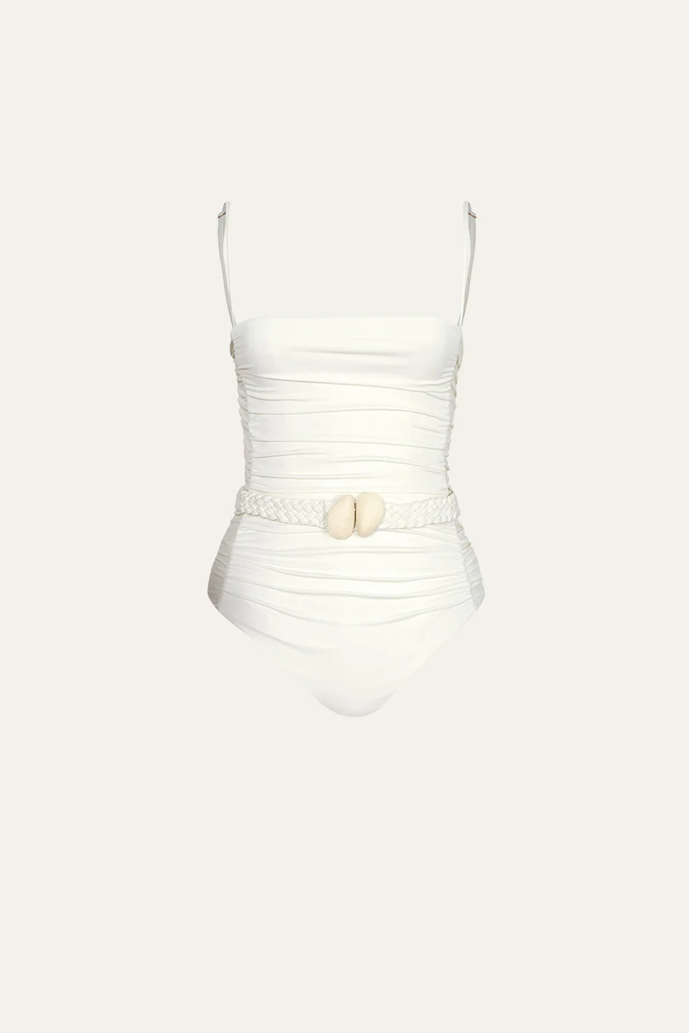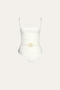 A sleek one-piece swimsuit in ecru, crafted from recycled Lycra. The ruched design is complemented by a braided belt with shell detailing at the waist, adding a unique Johanna Ortiz touch. Size and Fit: Designed for a slim fit. Please refer to our size chart for detailed measurements and guidance. Product Details: Closure: Slip On Composition: 78% Recycled Polyester, 22%Elastane Fabrication: Lycra Color: Ecru Made in Colombia