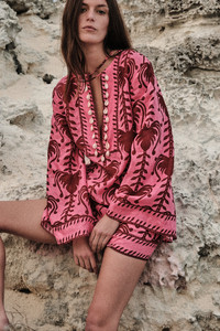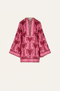 A tunic crafted from light linen, featuring wide sleeves and a relaxed silhouette. Adorned with shell details along the neckline, it blends artisanal charm with ease, making it perfect for warm-weather escapes and effortless layering. Size and Fit: Oversized fit for a relaxed silhouette. Please refer to our size chart for detailed guidance. Product Details: Closure: Slip On Composition: 100% Linen Fabrication: Light Linen Color: Pink/Cheery Made in Colombia Dimensions: Length 15.35''