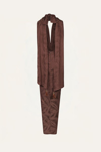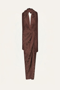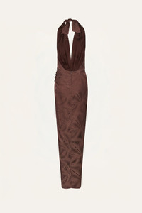 A halter-neck dress crafted in palm jacquard, offering rich texture and a refined sheen. Designed with a knotted front detail, a tie at the back, and a matching scarf, it features a fluid, versatile silhouette. Style it with minimal sandals for daytime occasions or pair it with statement jewelry for an elevated evening look. Size and Fit: - True to size. Please refer to our size chart for detailed guidance. Product Details: Closure: Tie At Back And Back Zipper Composition: 100% Viscose Fabrication: Palm Jacquard Color: Chocolate Made in Colombia Dimensions: Length 44.09''