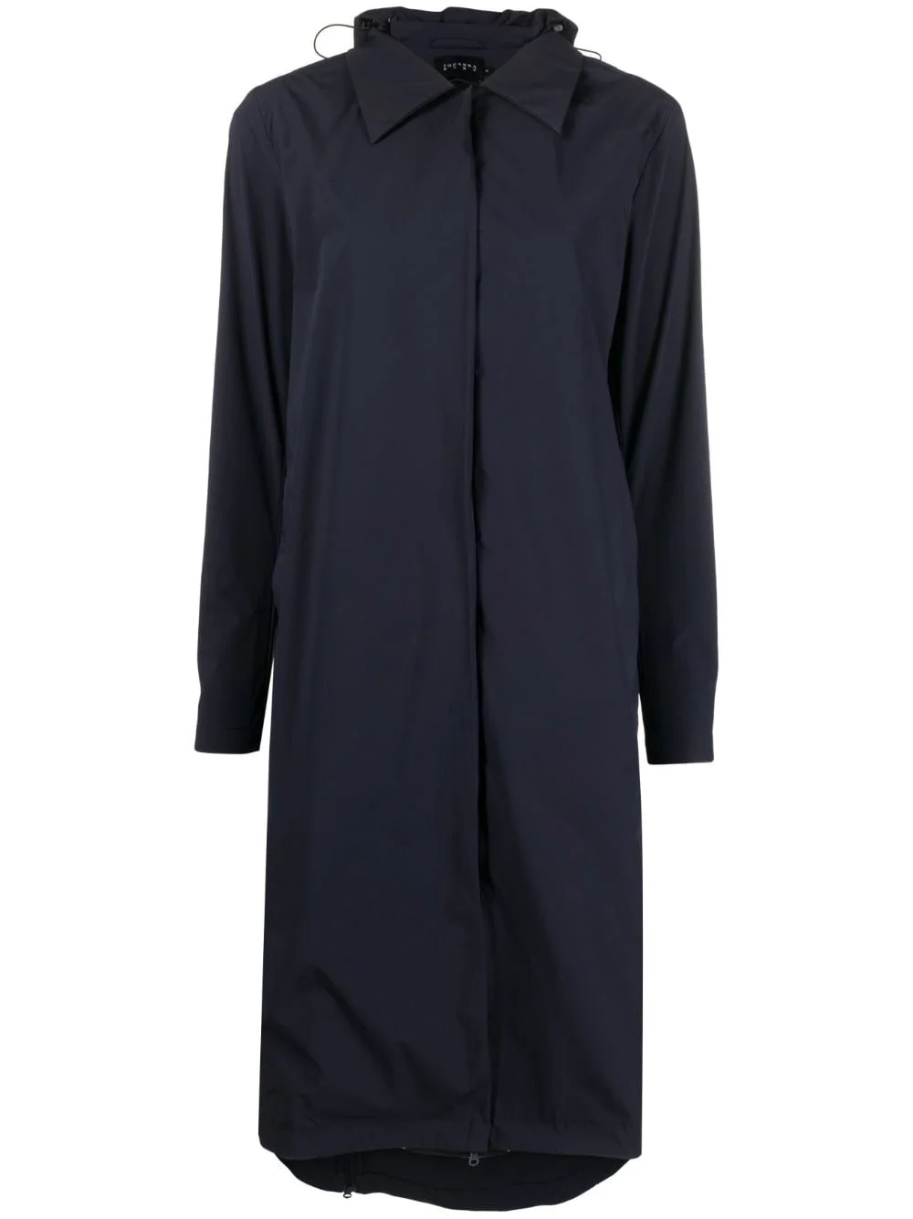 classic-collar hooded trench coat Highlights - Navy blue - Classic collar - Concealed hood - Concealed front button fastening - Long sleeves - Curved hem Made in United Kingdom Composition Polyamide 82%, Spandex/Elastane 18% SIZE & FIT Model measurements Height 5 ft 11 in(1.8 m) Bust/Chest 33.07 in(84 cm) Hips 37.4 in(95 cm) Waist 25.19 in(64 cm) FittingInformation Designed to be unstructured, offering a loose fit throughout The detachable panel offers the preference for a different fit Made from a lightweight stretch fabric, this piece offers elasticity and flexibility when worn This piece fits true to size – take your usual size