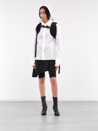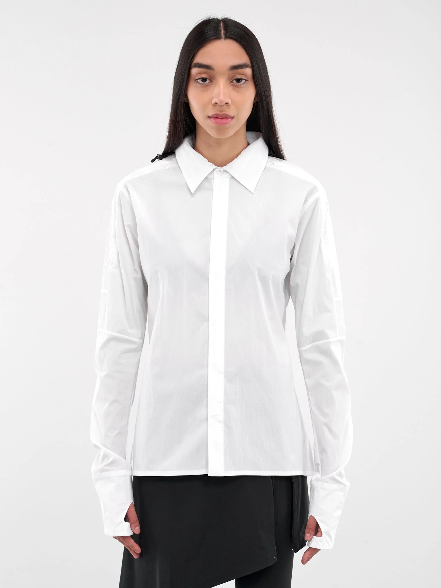 JOHANNA PARV shirt in white, paneled stretch cotton construction, spread collar, hood, adjustable drawcord, concealed zip vents, front concealed button placket closure, elongated sleeves, thumbholes, straight hem, slim fit. Made in UK 98% Cotton 2% Elastane Standard Sizing Model is 5'7" wearing size S. Bust: 32.5" Waist: 24" Hips: 32"