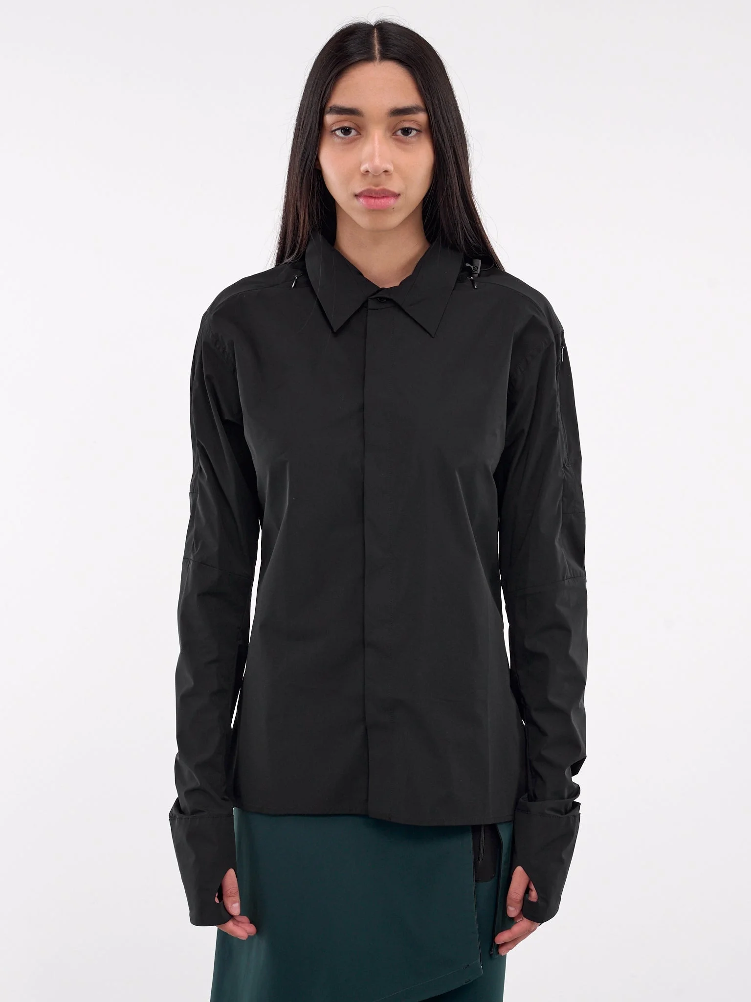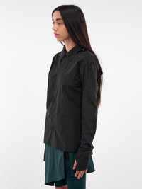 JOHANNA PARV shirt in black, paneled stretch nylon construction, spread collar, hood, adjustable drawcord, concealed zip vents, front concealed button placket closure, elongated sleeves, thumbholes, straight hem, slim fit. Made in UK 81% Recycled Polyamide 19% Elastane Standard Sizing Model is 5'7" wearing size S. Bust: 32.5" Waist: 24" Hips: 32"