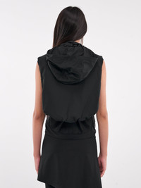 JOHANNA PARV vest in black, paneled nylon construction, padded & insulated, stand collar, hood, front concealed placket closure, front concealed zip pocket, sleeveless, armscyes, high-low hem, cropped length, fitted. Made in UK 100% Recycled Nylon Standard Sizing Model is 5'7" wearing size S. Bust: 32.5" Waist: 24" Hips: 32"