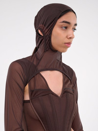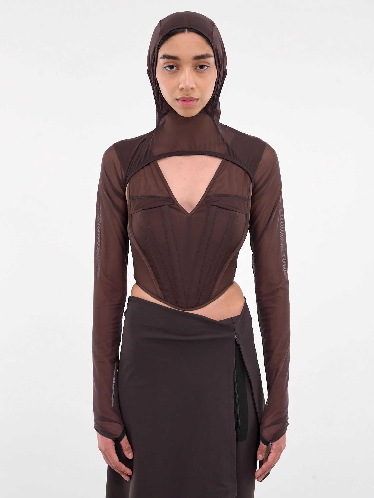 JOHANNA PARV sleeves in brown, paneled mesh construction, sheer paneling, hood, back cut-outs & ponytail hole, high neck, long sleeves, open front & back, cropped length, fitted. Made in UK 80% Polyamide 20% Elastane Standard Sizing Model is 5'7" wearing size S. Bust: 32.5" Waist: 24" Hips: 32"