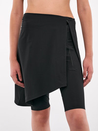 JOHANNA PARV skirt in black, paneled stretch nylon construction, high waist, asymmetric skirt overlay, above-knee length, form fit. Made in China 79% Recycled Polyamide 21% Elastane Standard Sizing Model is 5'7" wearing size S. Bust: 32.5" Waist: 24" Hips: 32"