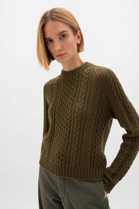 A heritage favourite, this luxe Aran cable cashmere jumper in olive green takes inspiration from traditional heritage designs. Cable stitching lends itself to this fresh silhouette. Its cropped design promises a contemporary edge, in a serene colour palette that echoes the Scottish landscape. PRODUCT DETAILS 100% Cashmere 8 Ply: Eight individual strands are twisted to create this yarn, producing a durable, medium-thick knit. Model is 5ft10 and wear a size S Made in Scotland Code: KAI05086