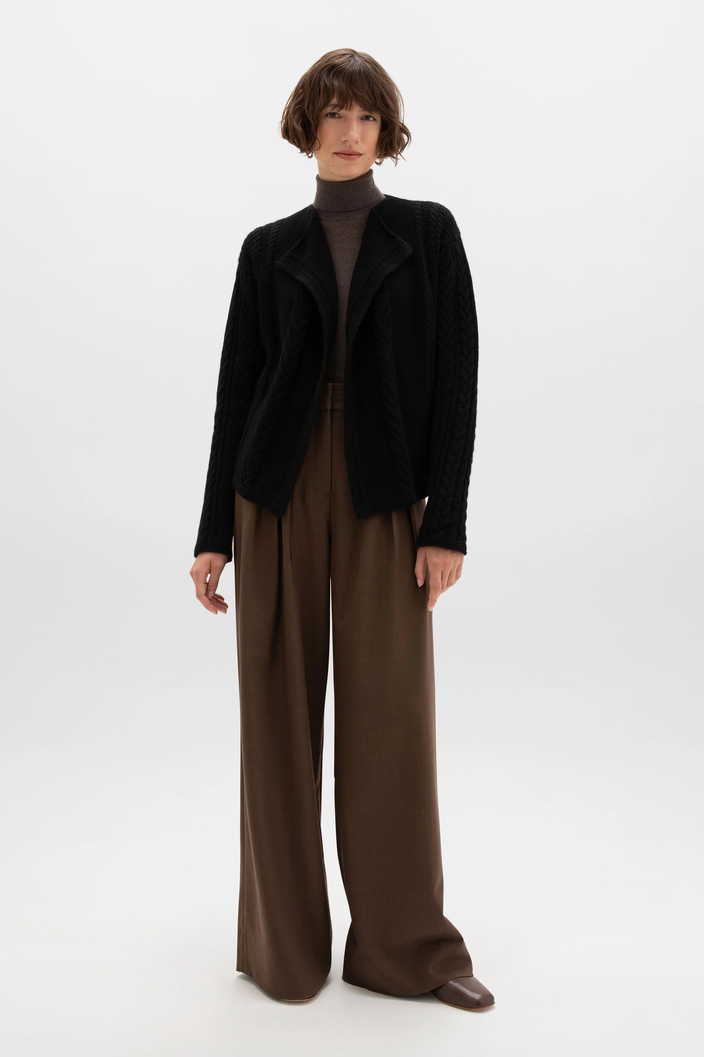 This collection highlight see us lend a heritage Aran cable stitch to a new, cropped design. Fitting just at the waist, with a relaxed waterfall opening, this is a flattering wardrobe hero in timeless black cashmere. The Finer Details: - Black Aran Cable Cashmere Waterfall Cardigan - 100% Cashmere 3 Ply: Three individual strands are twisted to create this yarn, producing a durable, lightweight knit. - Open Front - Oversized and generous – a truly luxurious feeling wrapping so much cashmere round the body. - Model is 177cm / 5ft8", UK 8, Chest 81cm / 32" - Model wears size S - Length: 53cm | 20.5" - This is based on size 'S' as proportions change slightly according to size. - Hand Wash - Free Worldwide Delivery
