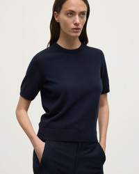 A modern short-sleeve silhouette in cashmere. Ideal for layering or worn alone. Light, soft, and redefined with traditional craftsmanship. PRODUCT DETAILS 100% Cashmere 2 Ply: Two individual strands are twisted to create this yarn, producing a durable, lightweight knit. Model is 5ft10 and wear a size S Made in Scotland Code: KAP05574