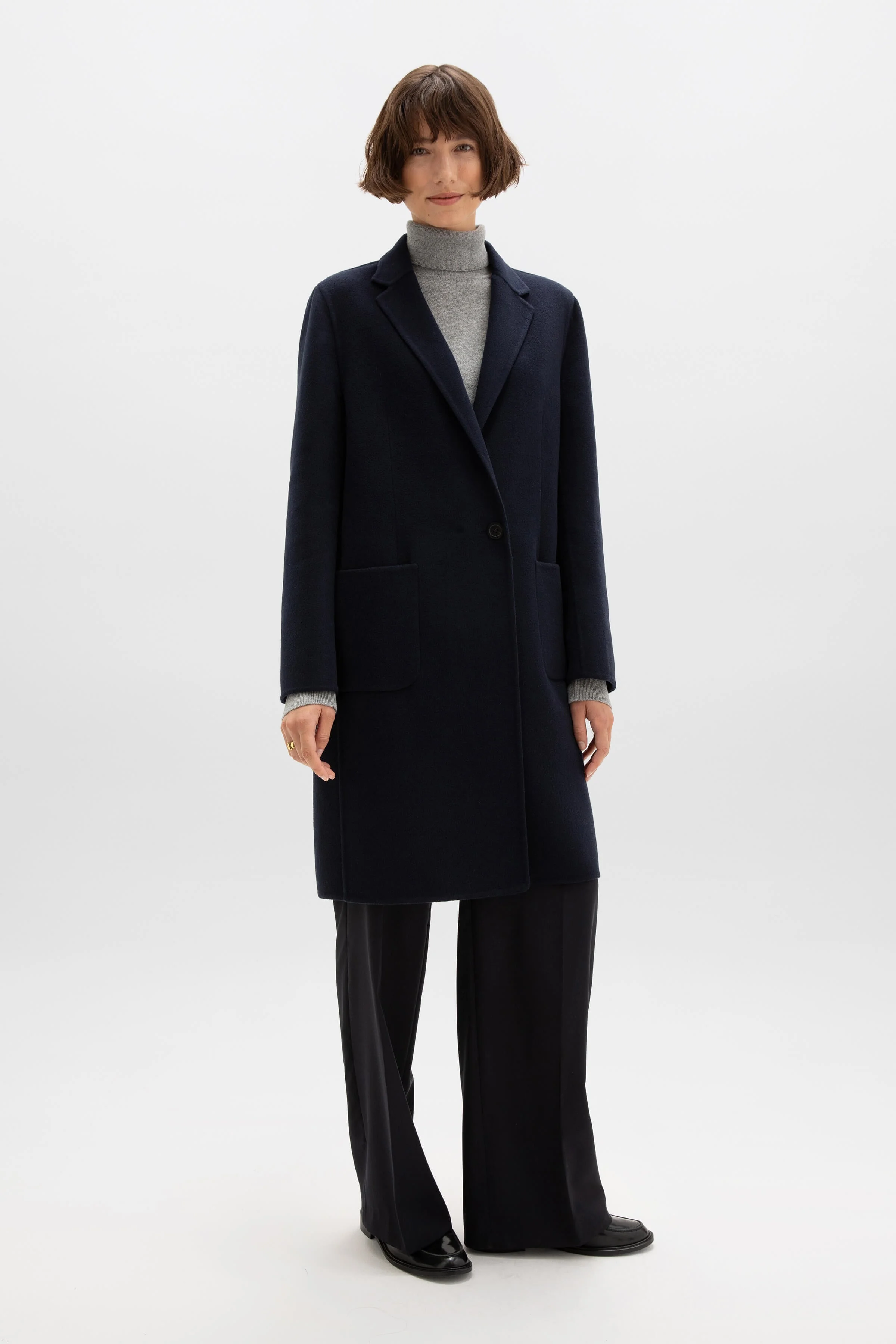 Traditional Italian hand construction makes this an extra special piece. An easy fit coat with a neat silhouette finishing just above the knee. Double breasted with a narrow overlap. Finished with s ingle button fastening with a b uffalo horn button and patch pockets. Made with the softest cashmere fibres for a luxe look and feel. PRODUCT DETAILS 100% Cashmere Model wears size 8 Made in Scotland Code: TA000520