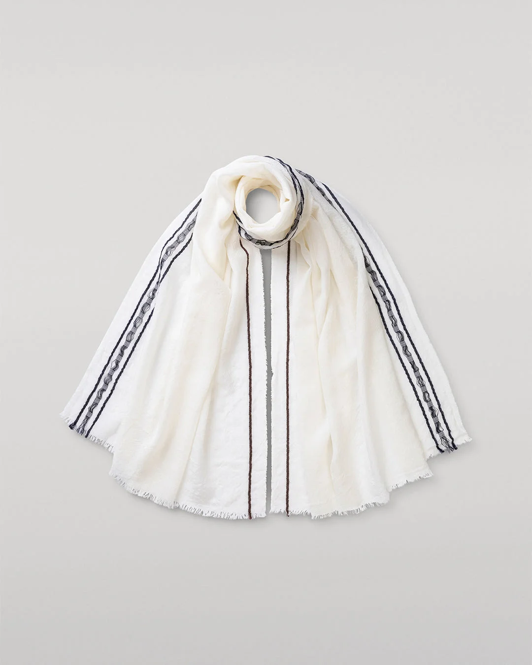 Distinguished by its float-edge finish, the Cyrus Scarf has a refined, tactile quality. Crafted in our Elgin Mill from a blend of wool, cashmere, and silk, it feels soft against the skin and drapes with effortless fluidity. PRODUCT DETAILS 94% Wool 4% Cashmere 2% Silk White 180x70cm | 71x28" Made in Scotland Code: WB002860