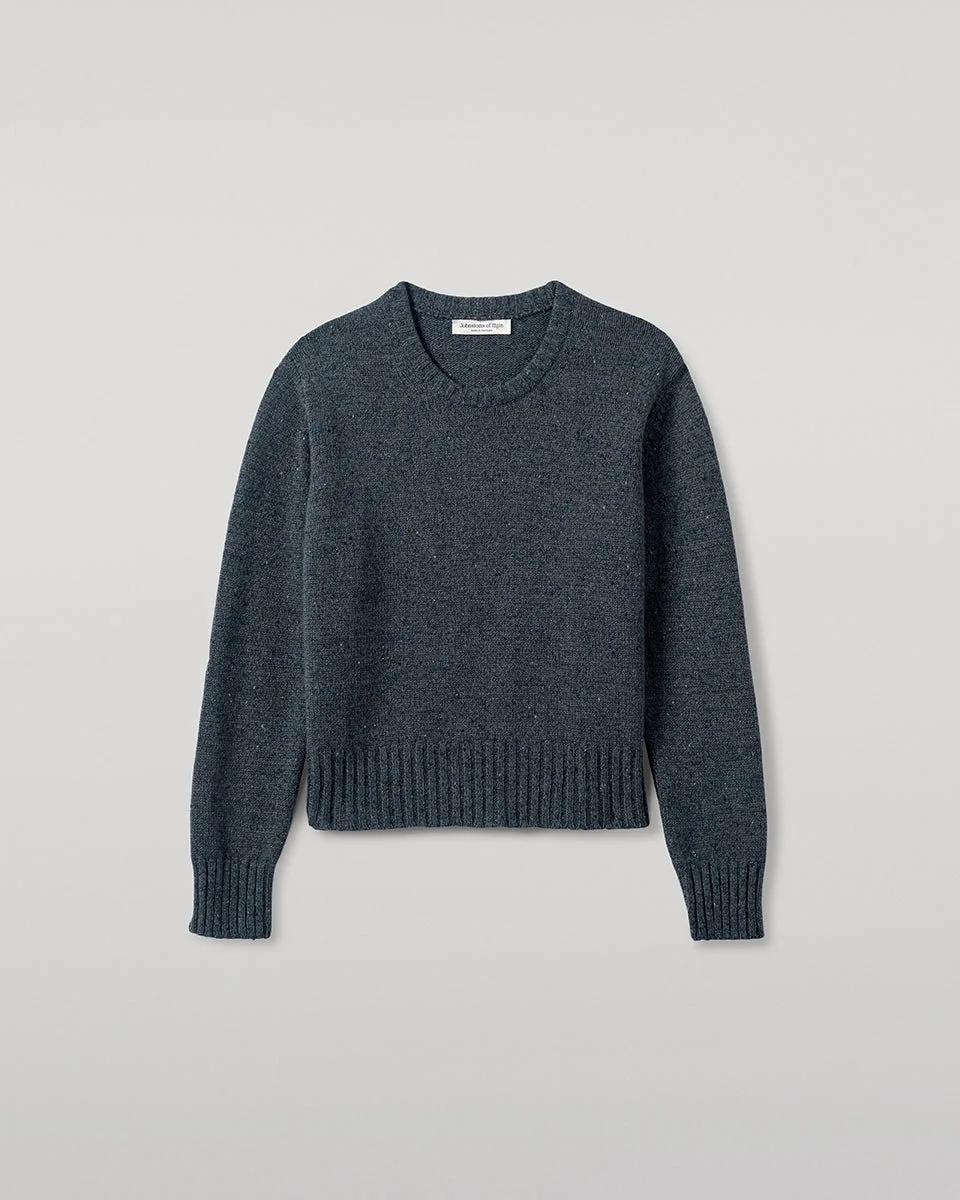 Textural Donegal cashmere crewneck. Spun in-house with hand-sprinkled neps for a one-of-a-kind finish. Donegal knitwear is crafted using multi-tonal yarns, spun with flecks of contrasting colour to create a beautifully mottled, heathered effect. At Johnstons of Elgin, we dye and spin our own Cashmere Donegal yarn, combining carefully selected hues from our seasonal palette. We then twist in complementary colours to create marls that are exclusive to us. PRODUCT DETAILS 100% Cashmere Model is 5ft10 and wear a size S Made in Scotland Code: KAC05289