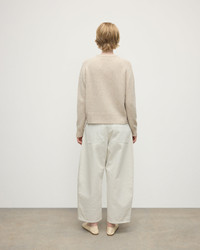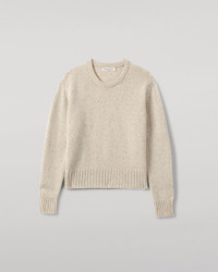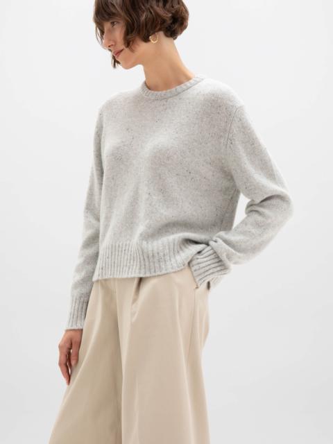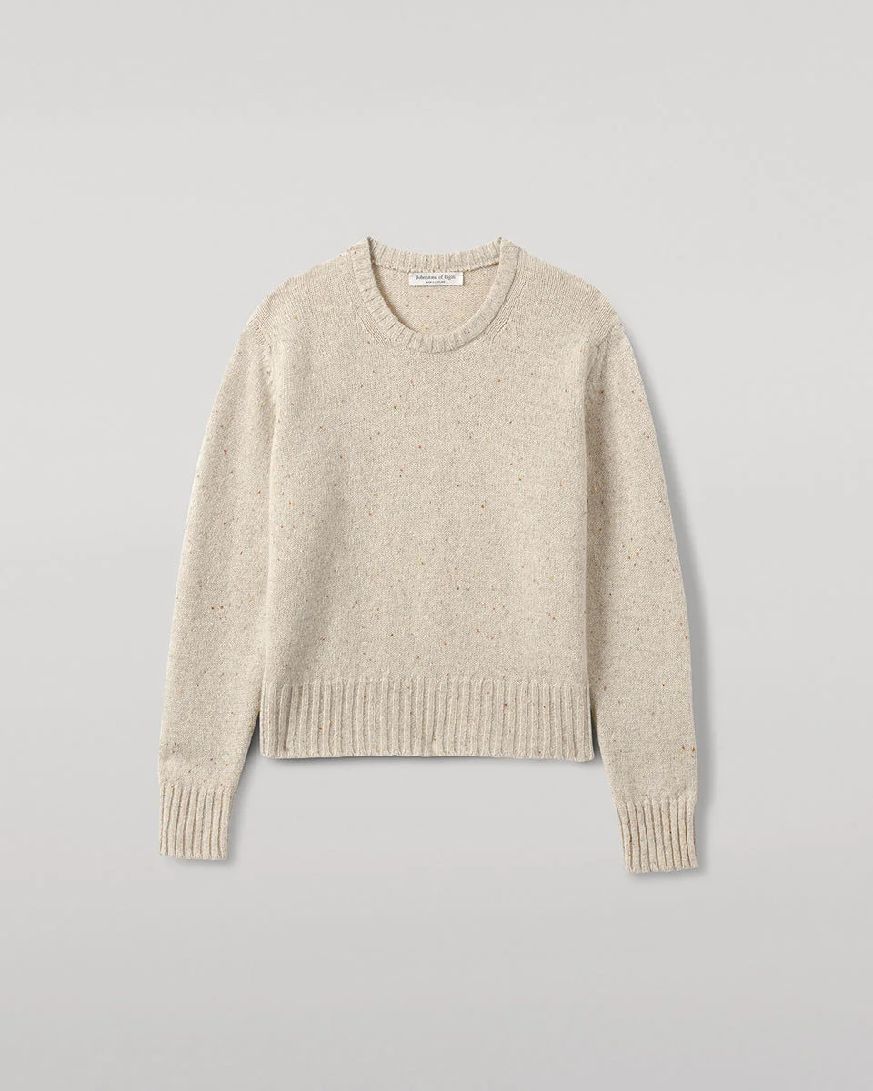 Textural Donegal cashmere crewneck. Spun in-house with hand-sprinkled neps for a one-of-a-kind finish. Donegal knitwear is crafted using multi-tonal yarns, spun with flecks of contrasting colour to create a beautifully mottled, heathered effect. At Johnstons of Elgin, we dye and spin our own Cashmere Donegal yarn, combining carefully selected hues from our seasonal palette. We then twist in complementary colours to create marls that are exclusive to us. PRODUCT DETAILS 100% Cashmere Model is 5ft10 and wear a size S Made in Scotland Code: KAC05289
