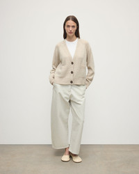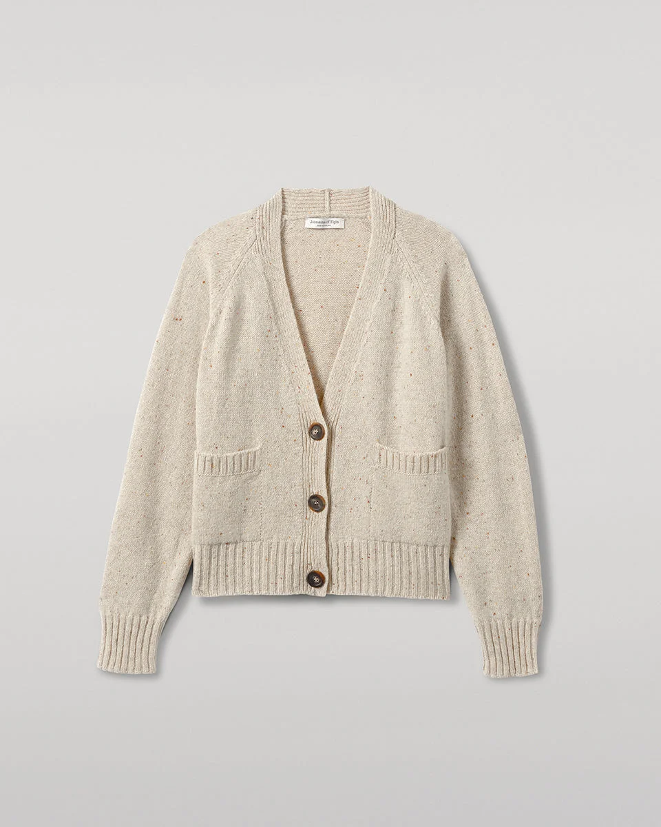 Boxy cardigan in Donegal cashmere with raglan sleeves and horn buttons. Our exclusive nepped yarn adds rich texture. Donegal knitwear is crafted using multi-tonal yarns, spun with flecks of contrasting colour to create a beautifully mottled, heathered effect. At Johnstons of Elgin, we dye and spin our own Cashmere Donegal yarn, combining carefully selected hues from our seasonal palette. We then twist in complementary colours to create marls that are exclusive to us. PRODUCT DETAILS 100% Cashmere Model is 5ft10 and wear a size S Made in Scotland Code: KAC05090
