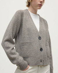 Boxy cardigan in Donegal cashmere with raglan sleeves and horn buttons. Our exclusive nepped yarn adds rich texture. Donegal knitwear is crafted using multi-tonal yarns, spun with flecks of contrasting colour to create a beautifully mottled, heathered effect. At Johnstons of Elgin, we dye and spin our own Cashmere Donegal yarn, combining carefully selected hues from our seasonal palette. We then twist in complementary colours to create marls that are exclusive to us. PRODUCT DETAILS 100% Cashmere Model is 5ft10 and wear a size S Made in Scotland Code: KAC05090
