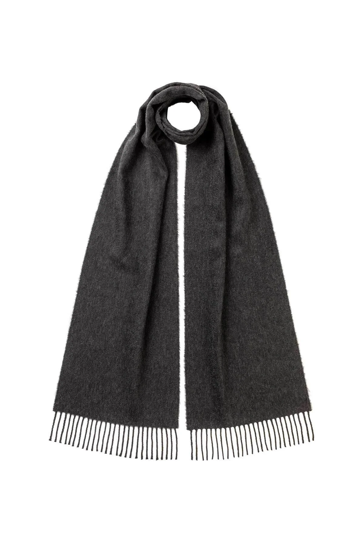 Our charcoal grey cashmere scarf is a wardrobe essential. Crafted from the finest cashmere fibres, it offers exceptional softness, warmth, and a timeless design. The unique ripple hand finish, created with natural, hand-worked teasels, adds a sophisticated touch. PRODUCT DETAILS 100% Cashmere 180x25cm | 71x10" Made in Scotland Code: WA000016