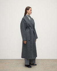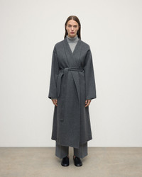 Expertly crafted for the modern woman, this tailored mid grey cashmere wrap coat is a must-have addition. Made with luxurious cashmere, it offers both warmth and style. The versatile wrap design and tailored fit create a flattering silhouette. PRODUCT DETAILS 100% Cashmere Mid-calf length Model is 5ft10 and wear a size S Oversized and generous – a truly luxurious feeling wrapping so much cashmere round the body. Double faced construction, where the cloth is split and the seams are encased within the cloth, giving a very clean look with no raw edges or seams visible and no need for full lining making the coat much softer and easier to wear. • This is a traditional construction done by hand. • Generous wrap. • Unlined. • Deep armhole with tapered full-length sleeve. • Dropped shoulder. • Self-fabric belt. • Stand up collar when wrapped but can be rolled over like a shawl collar. • Pockets in the side seams. Made in Scotland Code: TA000621