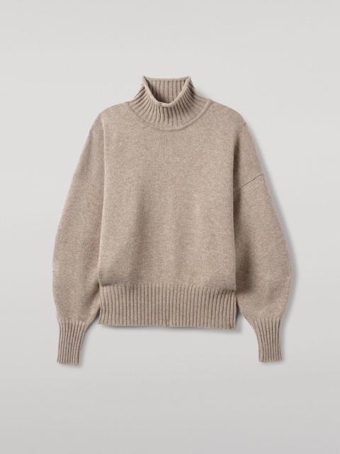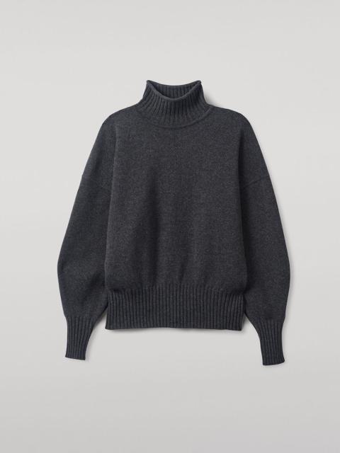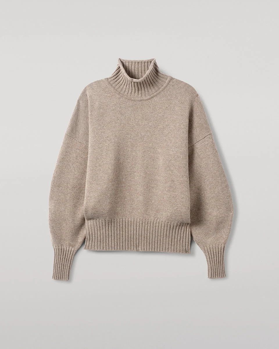Roomy ribbed jumper in 100% cashmere. High neckline, ballooned sleeves and seasonal tones. PRODUCT DETAILS 100% Cashmere 6 Ply: Six individual strands are twisted to create this yarn, producing a durable, medium-thick knit. Model is 5ft10 and wear a size S Made in Scotland Code: KAA05585