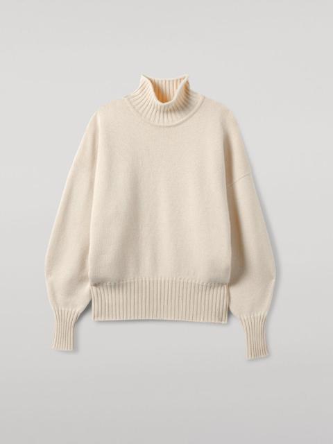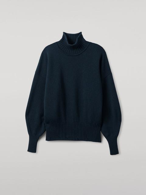Roomy ribbed jumper in 100% cashmere. High neckline, ballooned sleeves and seasonal tones. PRODUCT DETAILS 100% Cashmere 6 Ply: Six individual strands are twisted to create this yarn, producing a durable, medium-thick knit. Model is 5ft10 and wear a size S Made in Scotland Code: KAA05585