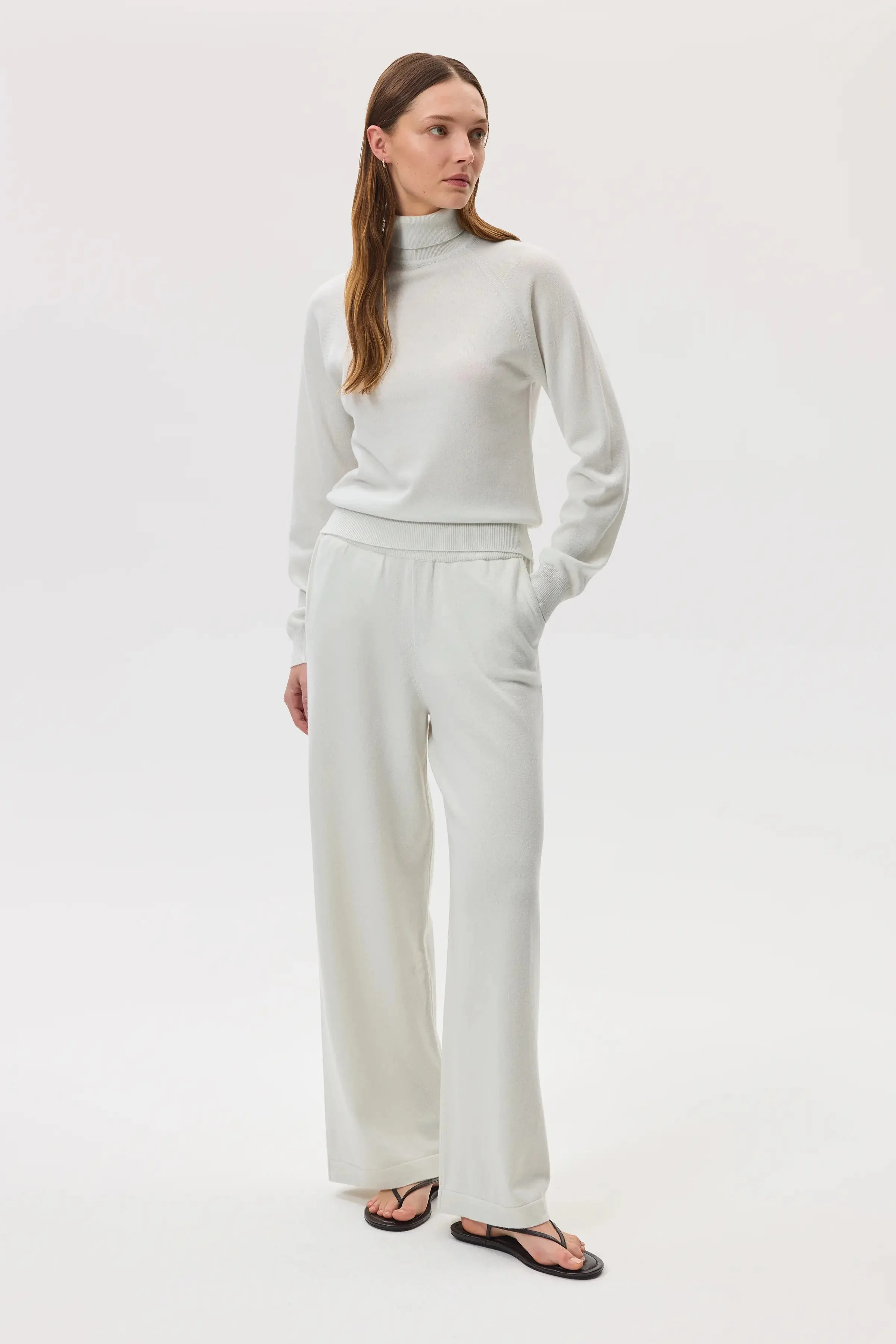Our Zinc white cashmere trousers are loose fitting but not too wide, with just a touch of polyester to help keep their shape wear after wear. These high-rise cashmere pants were so popular last summer that we've brought them back for another year. Wear with our White Cashmere Roll Neck Jumper for a luxurious and effortlessly chic co-ord. Zinc White – A Sophisticated Soft White with a Subtle Grey Undertone. The Finer Details: - Zinc White High Rise Cashmere White Culottes - 97% Cashmere 3% Polyamide - 3 Ply - Model is 175cm/5'9", UK 8 - Model wears size S - Inside Leg: 77cm | 30" - This is based on size 'S' as proportions change slightly according to size. - Hand Wash - Free Worldwide Delivery