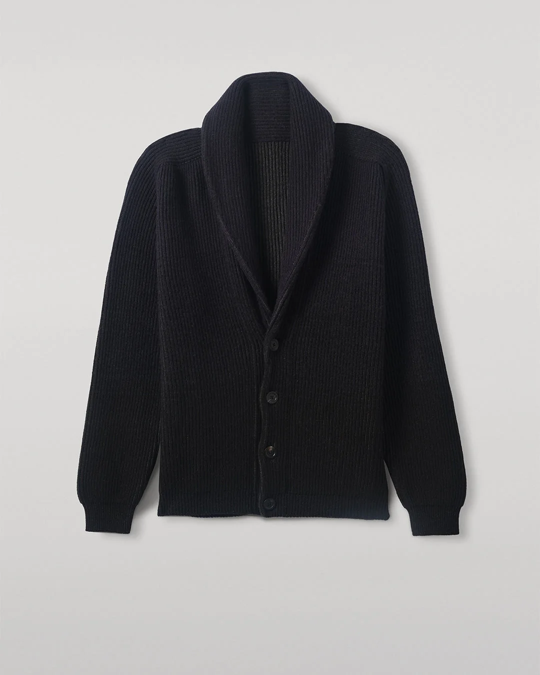 The Pioneer Black to Navy Cashmere Cardigan is a statement piece, featuring a subtly shaded and gradient rib shawl-collar design with clean, modern lines and a contemporary silhouette. Knitted using a close fisherman’s rib structure and plated in a third shade to add depth to the colour. Featuring a relaxed fit and elegant shawl collar, it’s perfect for layering over loungewear, or tailored trousers or for a polished look. Knitted in Scotland from the finest 100% cashmere, our unique interpretation of this traditional design is a true collector’s piece. Knitted in our softest 6-ply cashmere, this cardigan offers exceptional softness and warmth. PRODUCT DETAILS 100% Cashmere in Black 6 Ply: Six individual strands are twisted to create this yarn, producing a durable, medium-thick knit. Made in Scotland Code: UAA05750