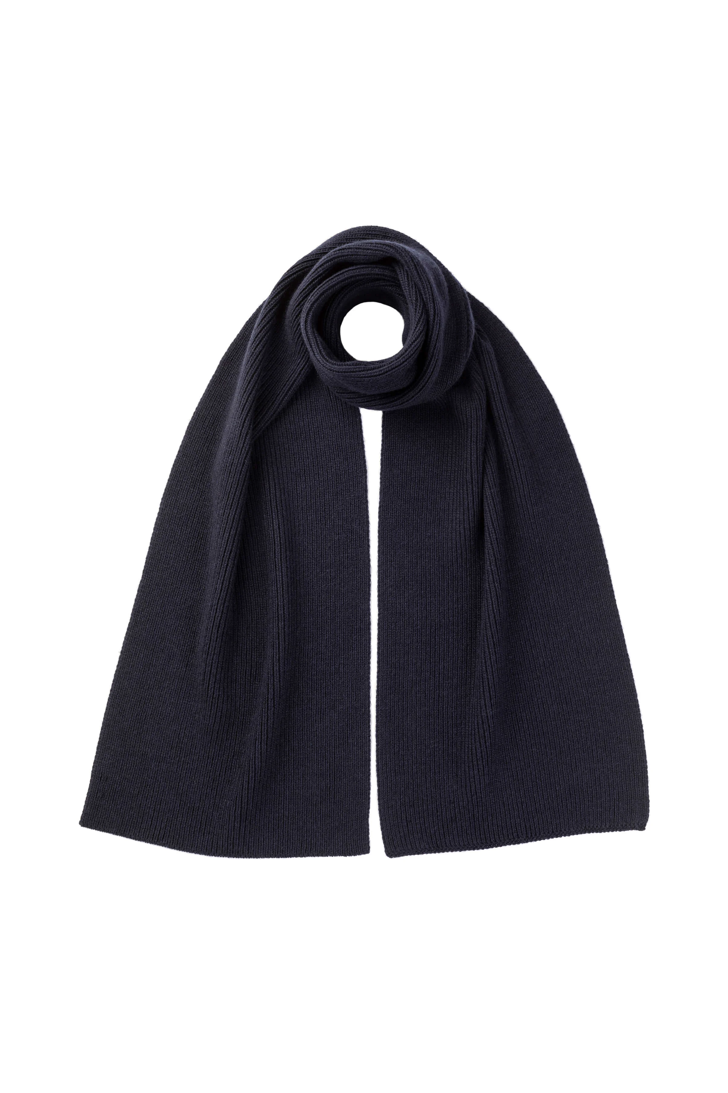 Understated and timeless, this cashmere scarf in classic Dark Navy is a staple of refined winter dressing. Spun from the finest fibres and rib-knitted in our Scottish Borders mill, it offers unmatched softness, warmth, and texture. PRODUCT DETAILS 100% Cashmere 175x30cm | 68x11" 4 Ply: Four individual strands are twisted to create this yarn, producing a durable, light-mid knit. Made in Scotland Code: HAC03537