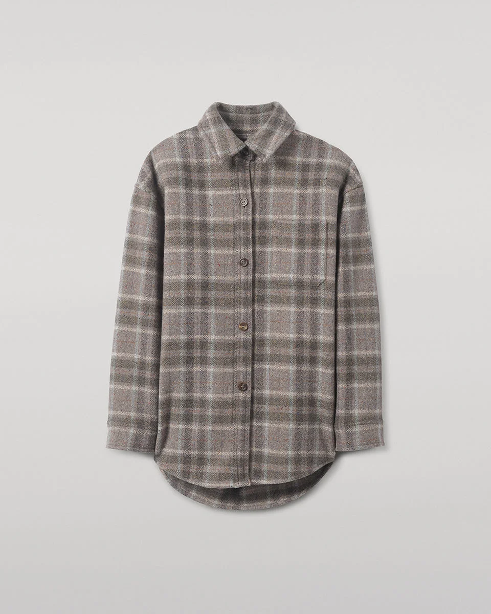 A relaxed, dropped shoulder shirt in an equal blend of luxe fibres. We combine melange lambswool, spun in our own mill, with cashmere Donegal for a super soft handle. A back pleat and curved hem add interest. Finished with patch pocket detail. PRODUCT DETAILS 50% Cashmere 50% Wool Slate Tweed Check Model is 5ft10 and wear a size S Oversized Fit • Oversized shirt style based on a classic men’s shirt detailing to give a “boyfriend” look. • Single breast patch pocket • Single button cuffs to be worn open or closed. • Classic shirt details with a back yoke and central back pleat with curved hem. • Dropped shoulder gives relaxed feel and fit. • Light enough to wear in replace of a cardigan and warm enough as a light outerwear piece. • Buffalo Horn buttons, top and cuff buttons branded • Drop shoulder. Made in Scotland Code: TB000754