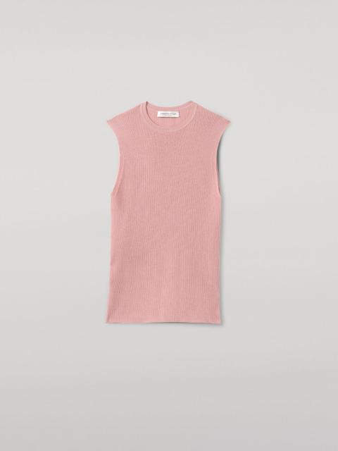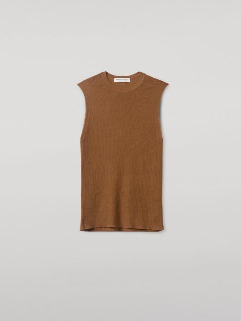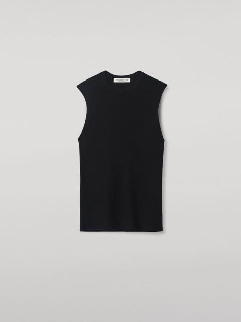 Sleeveless, high-neck tank in superfine cashmere. Clean lines and a modern cut in a warm camel hue. Style it alone or with the coordinating cardigan . PRODUCT DETAILS 100% Superfine Cashmere 3 Ply: Three individual strands are twisted to create this yarn, producing a durable, lightweight knit. Model wears size S Made in Scotland Code: KAI05559