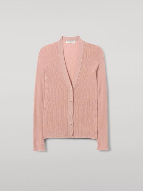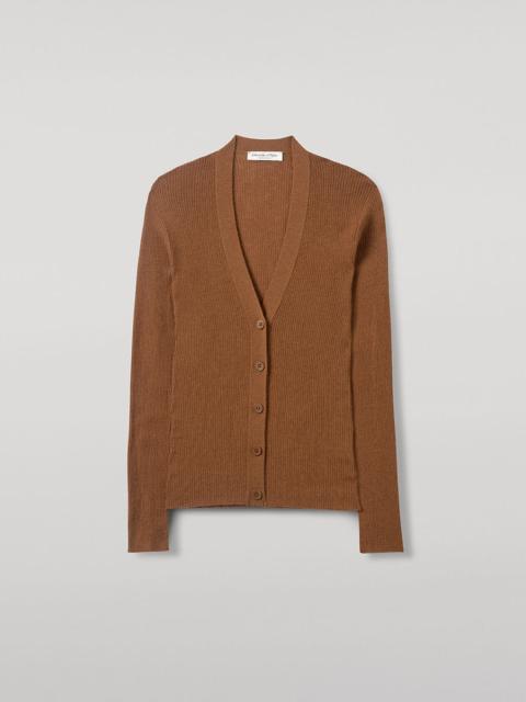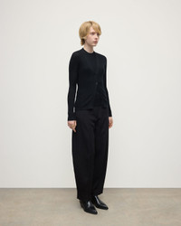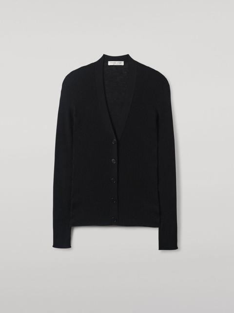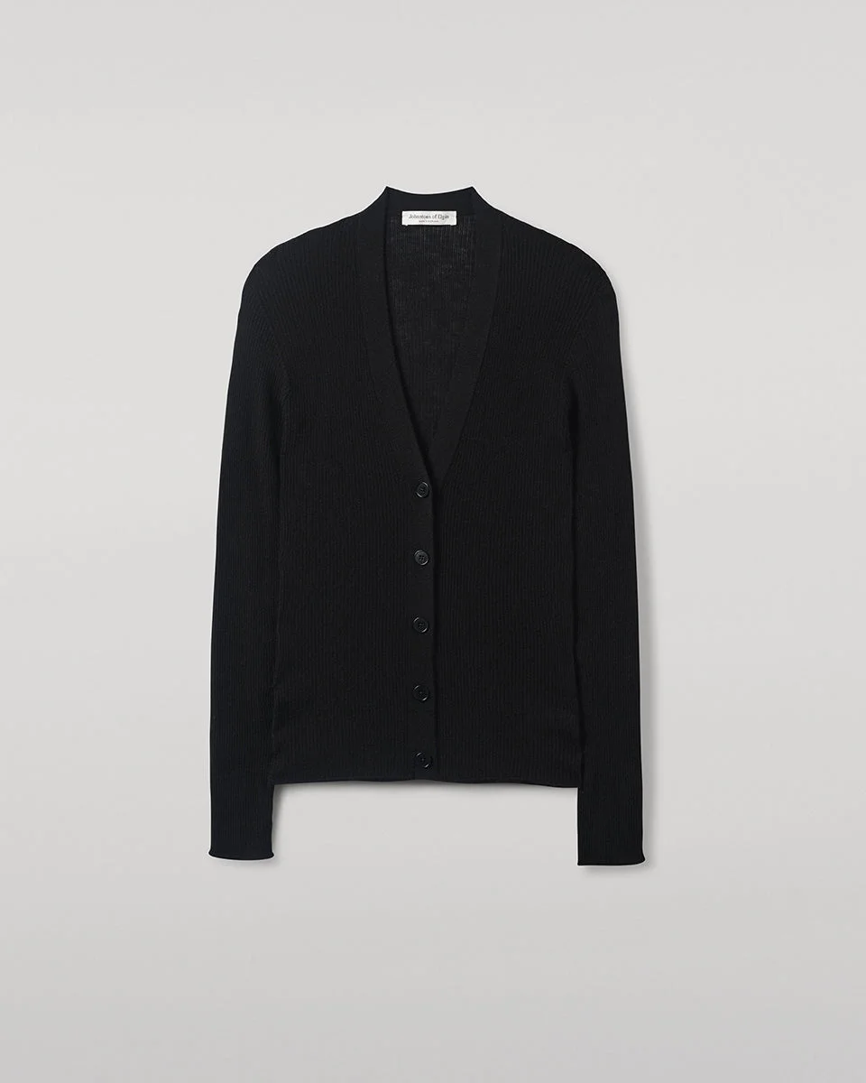 Refined V-neck cardigan in superfine cashmere. Slim rib texture and classic shades create an understated essential. PRODUCT DETAILS 100% Superfine Cashmere 3 Ply: Three individual strands are twisted to create this yarn, producing a durable, lightweight knit. Model is 5ft10 and wear a size S Made in Scotland Code: KAI05372