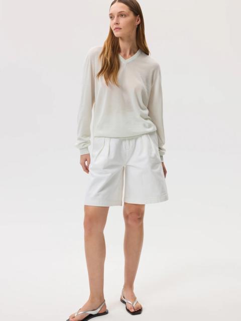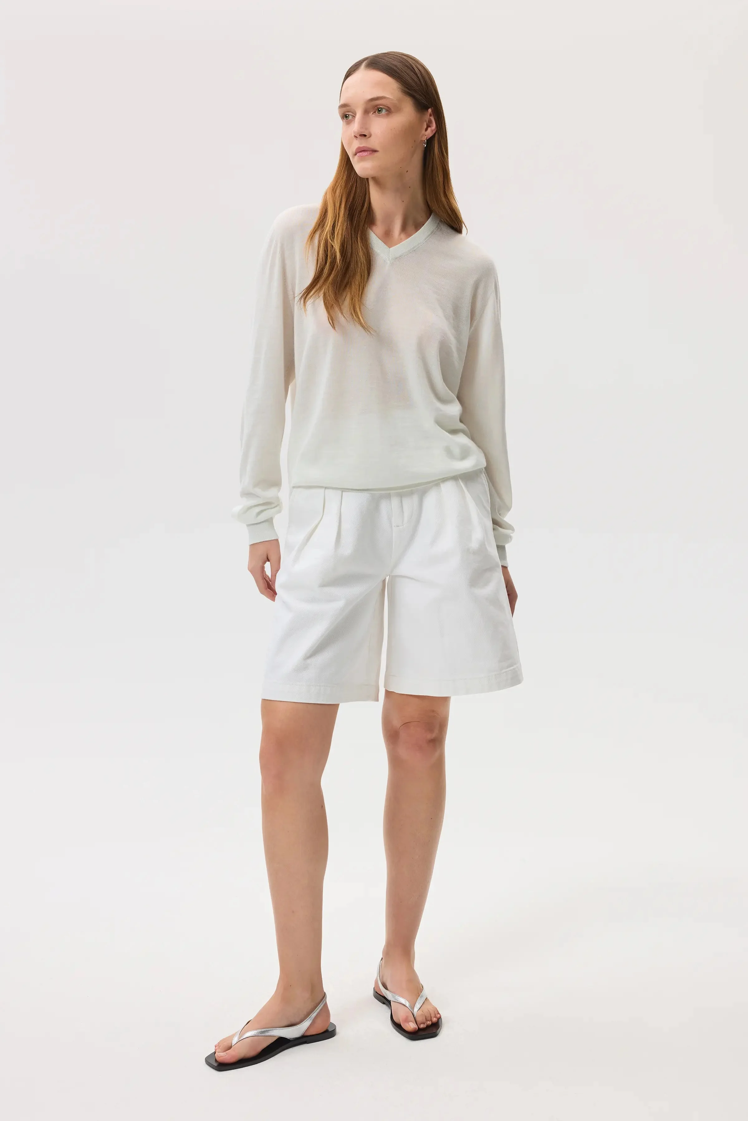 Our unisex slim-fit V-neck sweater in Zinc White is a must-have for your wardrobe. Featherlight and soft to the touch, it keeps you cool in summer and layers perfectly in cooler months. Modern, versatile, and endlessly wearable—this is style made simple. Zinc White – A Sophisticated Soft White with a Subtle Grey Undertone. The Finer Details: - Zinc White Superfine Cashmere V Neck - 100% Cashmere 3 Ply: Three individual strands are twisted to create this yarn, producing a durable, lightweight knit. - V Neck - Slim Fit - Female Model is 176cm / 5ft9.5", UK 8, Chest 81cm / 32" | Male Model is 189cm / 6ft2.5", Chest 91cm / 36" - Model wears size M - Length: 66cm | 25.5" - This is based on size 'S' as proportions change slightly according to size. - Hand Wash - Free Worldwide Delivery