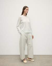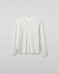 This relaxed jersey piece in zinc white is made with incredibly lightweight superfine cashmere. A loose hem finishes the look. Just like your favourite cotton long sleeve tee but with all the luxury of Cashmere. This easy-fit, seamless design is the perfect travel companion, creasing less than cotton or linen when you pack it away. Zinc White – A Sophisticated Soft White with a Subtle Grey Undertone. PRODUCT DETAILS 100% Superfine Cashmere 3 Ply: Three individual strands are twisted to create this yarn, producing a durable, lightweight knit. Model is 5ft10 and wear a size S Made in Scotland Code: KAI05318
