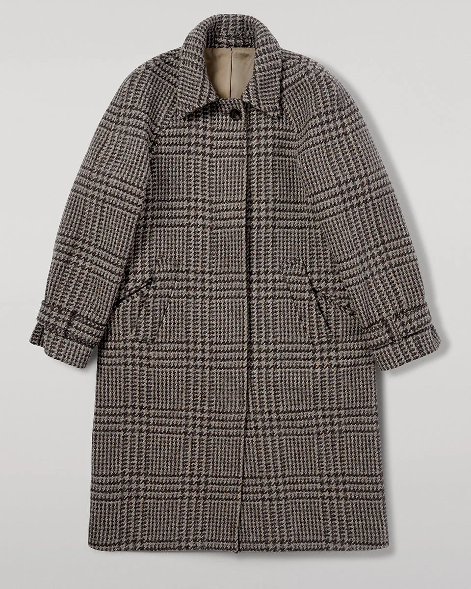 Our 100% lambswool women's overcoat is relaxed-fit, half-lined, with internally bound seams, double pockets, and raglan sleeves. The generous cut allows for ease of movement and accommodates cold-weather layering, perfect over lofty cashmere knitwear. The Balmacaan is the ideal match for long scarves and stoles , as its long front allows them to hang naturally, despite the oversized styling of the coat. PRODUCT DETAILS 100% Lambswool Below Knee-length Model is 5ft10 and wear a size S Relaxed • Oversized and voluminous. • Raglan sleeve. • Half lined in Cupro with bound seams internally. • Double pocket with soft cashmere lining for extra warmth and comfort. • Storm collar with detachable throat fastening. • Adjustable cuff strap to give a tighter fit to keep the cold out and to add volume to the sleeve. • Concealed button stand with Buffalo Horn Buttons, top button with branding. • Inspired by our men’s Balmacaan style. • Oversized and generous – think a wearable blanket. If you require a neater fit, size down. Made in Scotland Code: TD000517