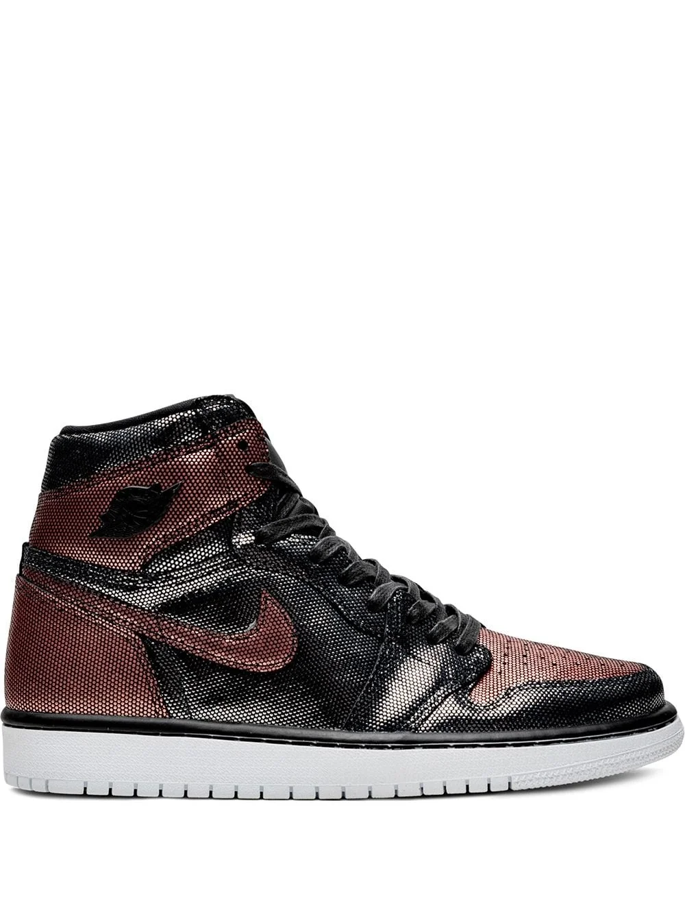 Air Jordan 1 Hi OG "Fearless" sneakers The Women's Air Jordan 1 “Fearless” is a special makeup of the timeless high-top silhouette. Borrowing graciously from the “SP Gina” Air Jordan 1 release, the upper of the “Fearless” motif applies a similar metallic mesh finish as the former, but instead features the same color blocking scheme found on many original Air Jordan 1s. A black mesh material covers the mid-panel, eyelets, toe cap and ankle collar with a contrast rose gold mesh featured on the lateral panel, ankle collar, and perforated toe. A rose gold Swoosh sits on the mid-panel with a solid black Wings logo on the collar completing the unique appearance of the upper. Women’s Air Jordan 1 “Fearless” release date: Holiday 2019. Made in Italy Composition Calf Leather 100%