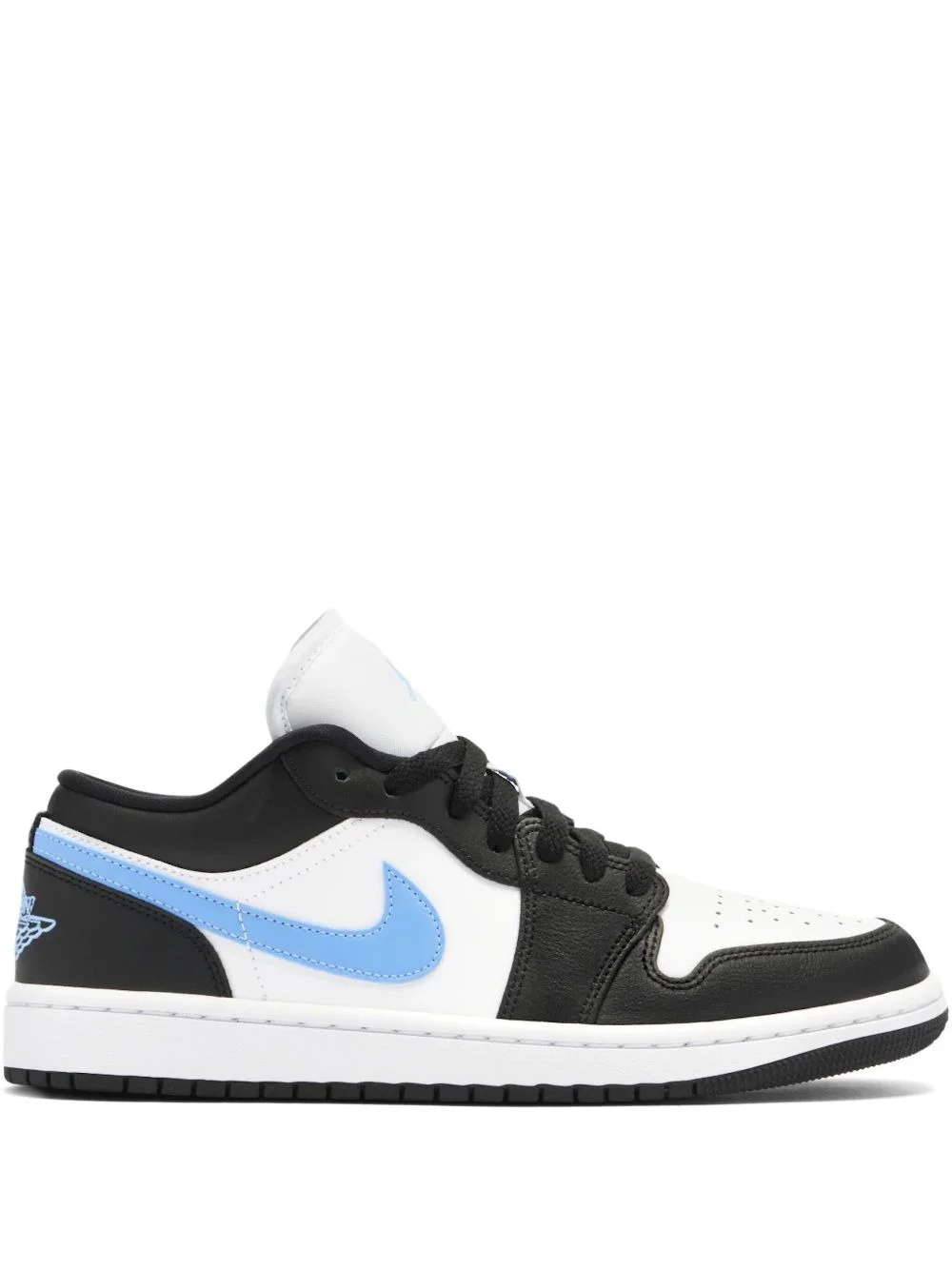 Air Jordan 1 Low "Black/University Blue" sneakers Released in 1985, the Air Jordan 1 Low stands out for its bold design. This pair comes in black, white and blue tones and, here, the 'NIKE AIR' branding on the tongue has commonly been replaced with a Jumpman logo while the line's wings insignia has moved to the lower heel from the ankle tab. Highlights - Black/blue/white - Leather - Signature air jordan wings logo - Signature swoosh logo detail - Contrasting panel detail - Round toe - Front lace-up fastening - Logo patch at the tongue - Branded insole - Rubber sole - These styles are supplied by a premium sneaker marketplace. stocking only the most sought-after footwear, they source and curate some of the most hard to find sneakers from around the world. Imported Composition Lining: Fabric 100% Outer: Leather 100% Sole: Rubber 100% SIZE & FIT FittingInformation This piece fits small – take one size up