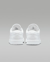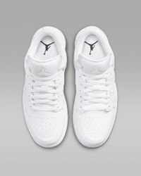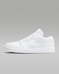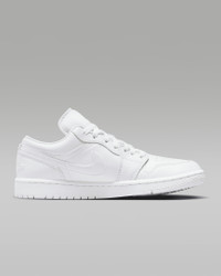 You tryna be comfortable all day, every day? We got you. The AJ1 Low has all the looks of the hoops original, with less weight and a sleek profile. Plus, they go with any 'fit—just lace up and go. Benefits - Nike Air technology absorbs impact for cushioning with every step. - Genuine and synthetic leather and textile materials combine for lightweight durability and a great fit. - Rubber outsole provides ample traction. Product Details - Jumpman logo on tongue - Stitched-down Swoosh logo - Shown: White/White/White - Style: DV0990-111