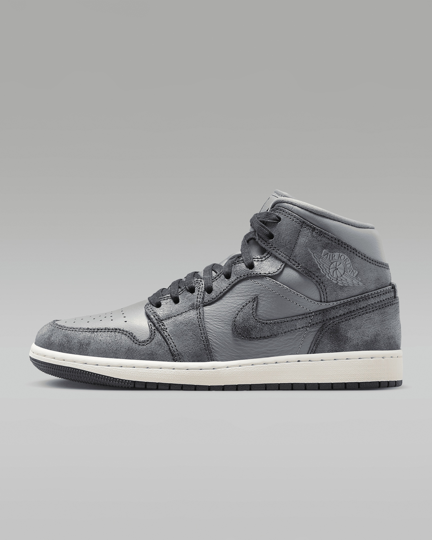 Up your AJ1 game. This luxe, tonal edition features stonewashed suede, heritage leather, and waxed laces. Lace up and hit that tunnel. Benefits - Nike Air unit in the heel delivers lightweight, responsive cushioning. - Solid rubber outsoles give you traction on a variety of surfaces. Product Details - Jumpman Air tongue label - Wings logo on the side of collar - Perforated toe - Shown: Smoke Grey/Sail/Off Noir - Style: FJ3448-001
