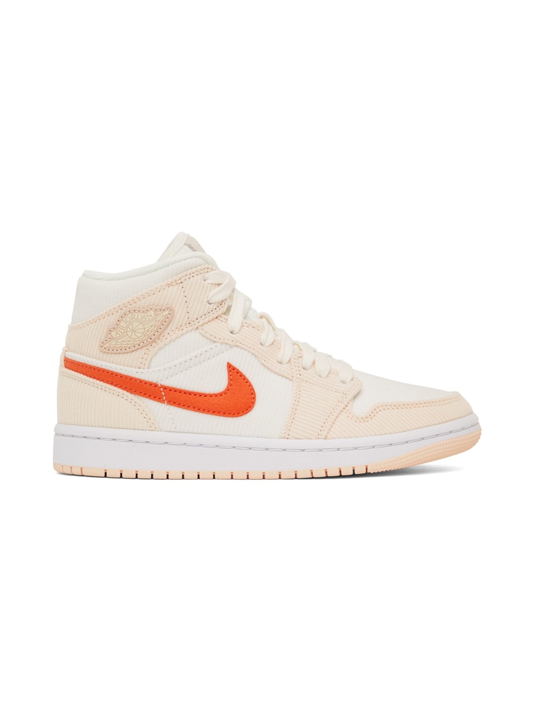 Mid-top paneled corduroy sneakers in pink and white. Round toe. Lace-up closure. Textile logo patch at padded tongue. Padded collar. Felted Swoosh appliqué in orange at sides. Tonal logo patch at outer side. Textured rubber midsole in taupe. Tonal treaded rubber outsole Supplier color: Sail/Orange quartz Upper: textile. Sole: rubber.