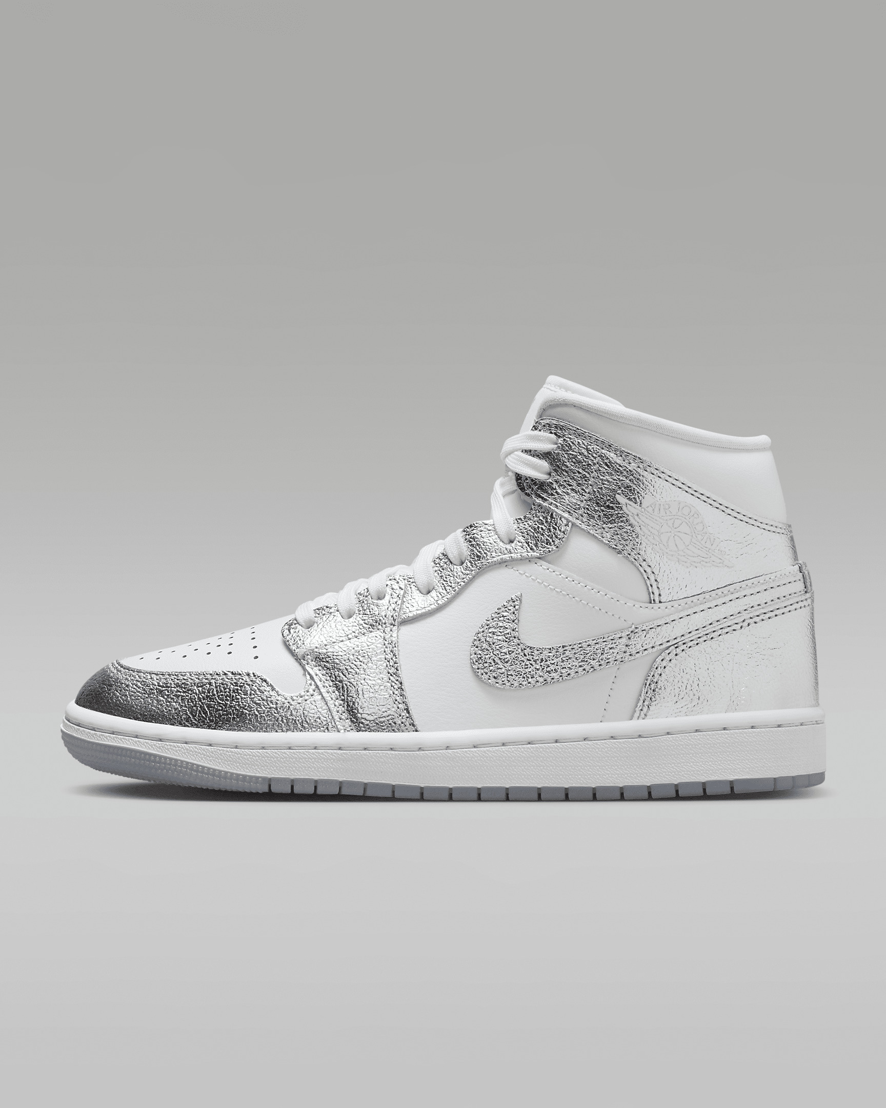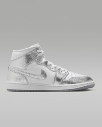 The shoe that started it all gets some sparkle in this stunning iteration of the AJ1. The iconic mid-top silhouette glows up with a dazzling, chrome-like upper that catches eyes and turn heads. Product Details - Wings logo on heel - Foam midsole - Rubber traction - Jumpman Air logo on tongue - Shown: White/Wolf Grey/Metallic Silver - Style: FN5031-100
