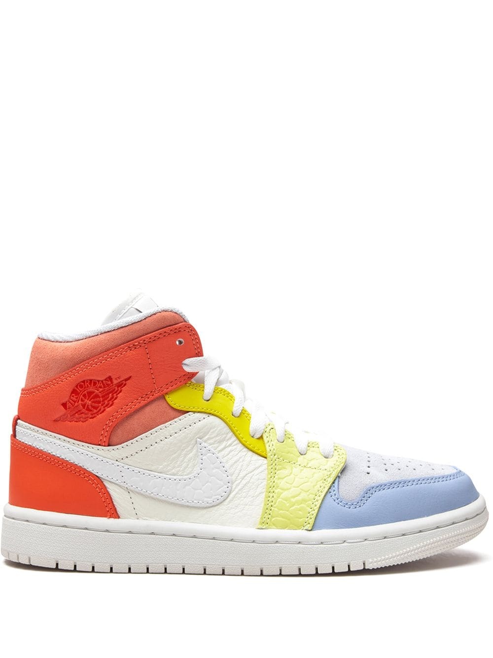 Air Jordan 1 Mid "To My First Coach" sneakers And Jordan strikes again, with new colourways. These multicoloured Air Jordan 1 Mid sneakers come with a tonal Swoosh on the side and a blue toe cap while the collar and heel are where the palette starts to increase in volume, in orange and yellow tones for a bold look. Imported Composition Outer: Leather 100% Lining: Nylon 100% Sole: Rubber 100%