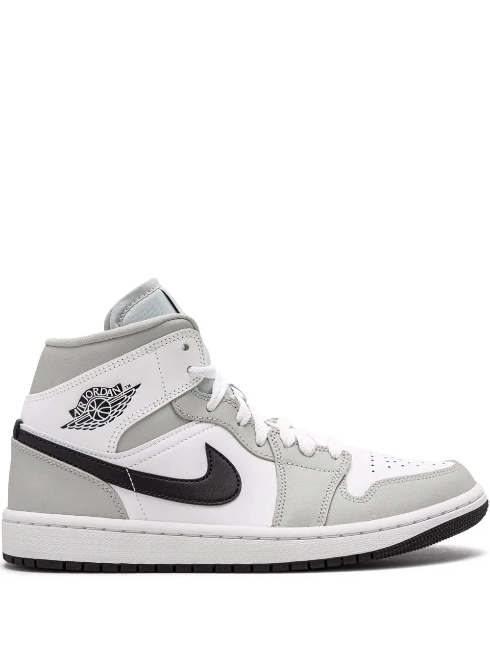 Air Jordan 1 Mid sneakers And Jordan strikes again - in a new colourway. In a grey, white and black colourway, these Air Jordan 1 sneakers stand out thanks to their mid-top silhouette, contrasting Air Jordan Wings logo on the side, and Jumpman patch at the tongue. They're completed by the usual two-toned rubber sole for a stylish yet comfortable look. Highlights - Grey/white - Leather - Signature air jordan wings logo - Signature swoosh logo detail - Contrasting panel detail - Round toe - Front lace-up fastening - Ankle-length - Branded insole - Rubber sole - These styles are supplied by a premium sneaker marketplace. stocking only the most sought-after footwear, they source and curate some of the most hard to find sneakers from around the world. Imported Composition Leather 100% SIZE & FIT FittingInformation This piece fits small – take one size up