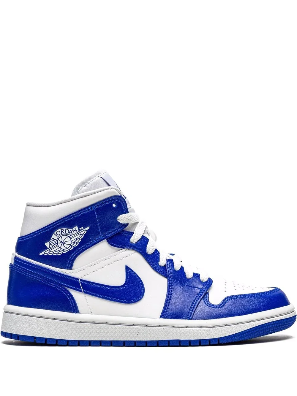 Air Jordan 1 Mid "Kentucky Blue" sneakers And Jordan strikes again - in a new colourway. These Air Jordan 1 Mid sneakers come with a contrasting Swoosh and a blue and white toe cap and tongue. The collar and heel are where the palette starts to increase in details, with a Jumpman patch on the tongue and Air Jordan Wings logo on the sides. A two-toned rubber sole finishes the look with comfort and style. Highlights - Blue/white - Leather - Signature air jordan wings logo - Signature swoosh logo detail - Round toe - Front lace-up fastening - Logo patch at the tongue - Ankle-length - Branded insole - Rubber sole - These styles are supplied by a premium sneaker marketplace. stocking only the most sought-after footwear, they source and curate some of the most hard to find sneakers from around the world. Imported Composition Leather 100% SIZE & FIT FittingInformation This piece fits small – take one size up