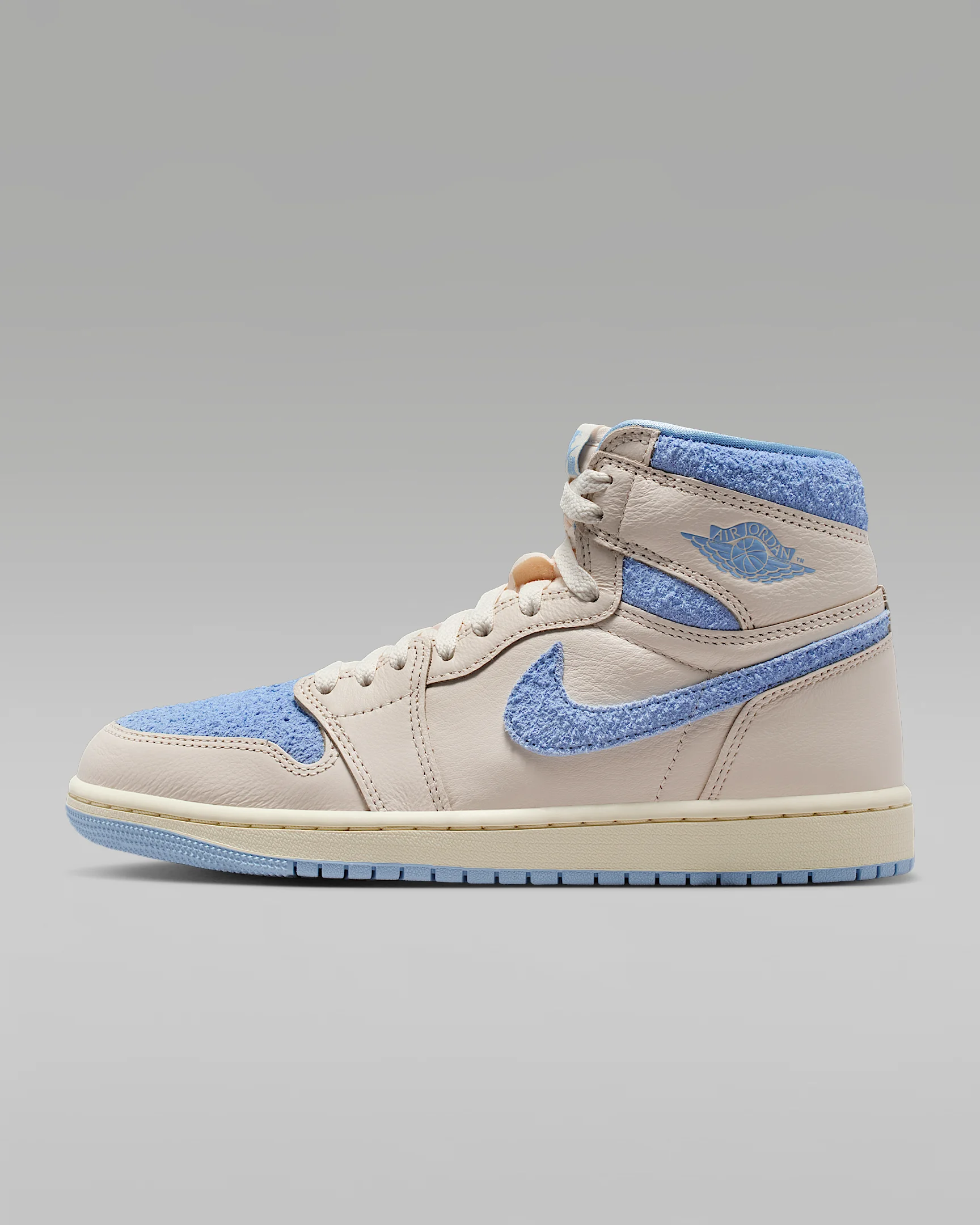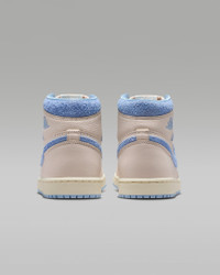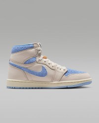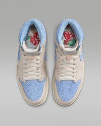 This iteration of the AJ1 reimagines Mike's first signature model with a fresh mix of colors. Premium materials, soft cushioning and a padded ankle collar offer total support and celebrate the shoe that started it all. Benefits - Premium construction delivers comfort and iconic appeal. - Encapsulated Nike Air-Sole unit in the heel gives you soft cushioning. Product Details - Shown: Pale Ivory/Coconut Milk/Psychic Blue - Style: FD2596-102